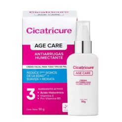 Cicatricure Age Care antiarrugas humectante con ácido hialuronico, reduce la profundidad de las primeras arrugas y mejora la hidratacion de la piel. ademas contiene filtros UV que ayudan a prevenir la formación temprana de nuevas arrugas. Brinda a la piel una sensación de suavidad y bienestar. Textura ligera y de rápida absorción.