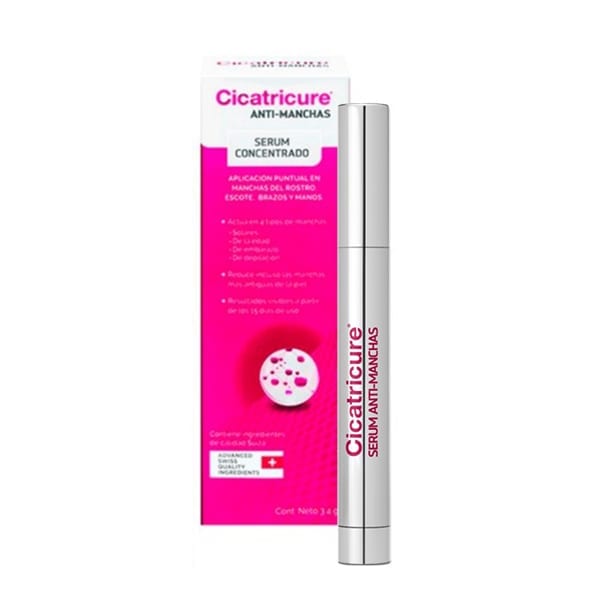 Hay manchas en la piel que cuesta tratar más que otras, llegó el NUEVO CICATRICURE ANTI-MANCHAS SERUM CONCENTRADO. Un innovador tratamiento de aplicación localizada para manchas del rostro, escote, brazos y manos. Su fórmula posee ingredientes activos en altas concentraciones, capaces de reducir manchas producto del sol, de la edad, del embarazo y de la depilación.