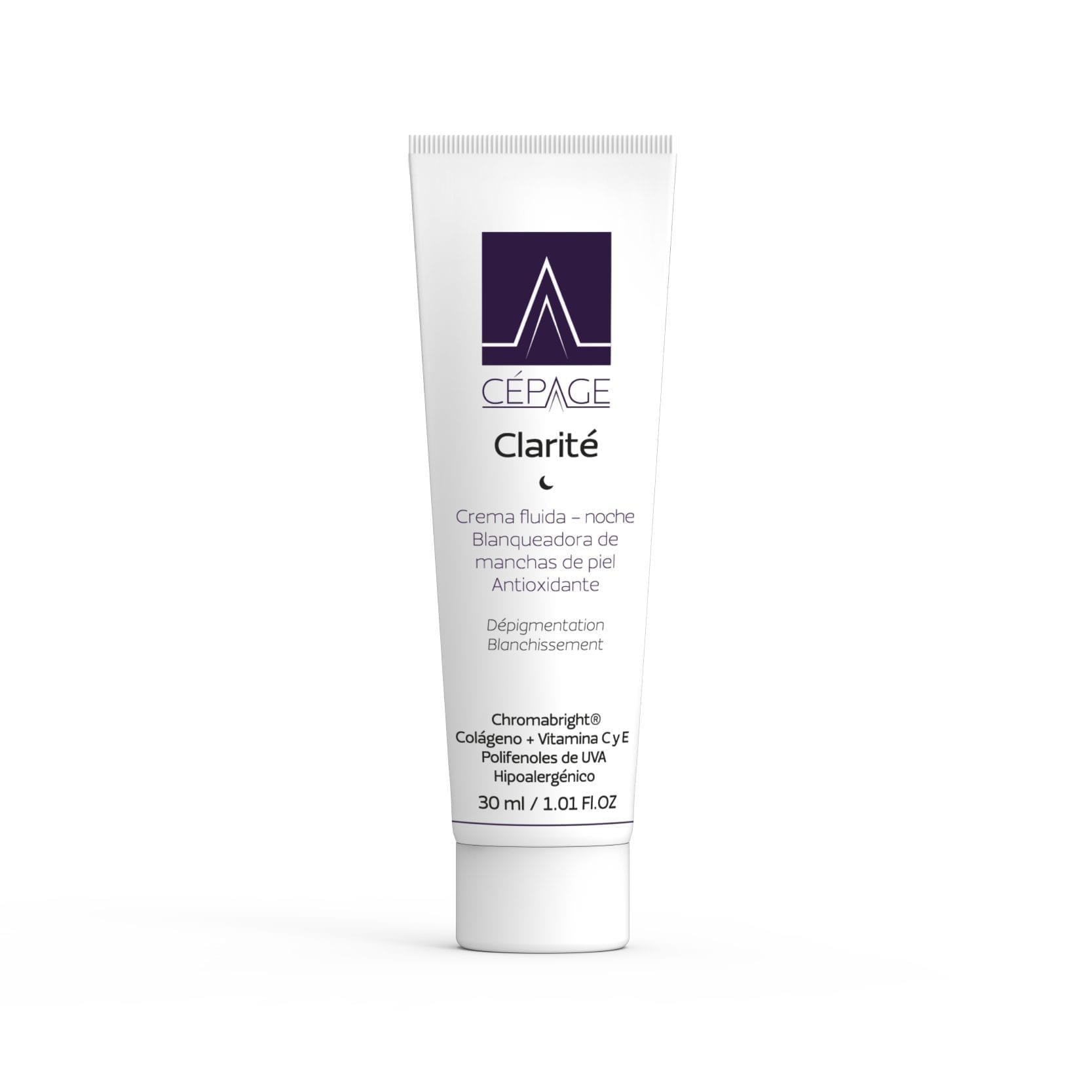 Clarité es una crema fluída despigmentante que atenúa manchas y unifica el tono de la piel otorgándole luminosidad. Contiene activos hidratantes y antioxidantes. Cuidado diario ideal para pieles hiperpigmentadas y coadyuvante de tratamientos médicos.