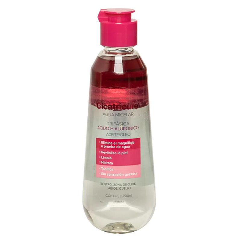Cicatricure Agua Micelar Trifásica Aceite/Oleo, con Ácido Hialurónico, remueve restos de impureza mientras cuida la piel, tonificándola.