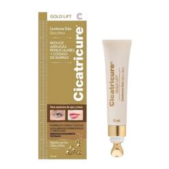Cicatricure Gold Lift Contorno Duo para ojos y boca reduce arrugas perioculares y codigo de barra. Combina Péptidos con Oro, Calcio y Silicio más un ingrediente activo que actúa como un Self-Filler cutáneo. Eficacia comprobada en: Ojeras, Bolsas, Arrugas perioculares (Patas de gallo), Arrugas verticales (Código de barras). Desvanece arrugas.