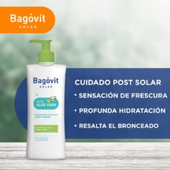 Bagóvit Gel Post Solar Hidratante con Aloe Vera al 80% es una combinación equilibrada de emolientes refrescantes que aseguran una óptima penetración. Además, provee una profunda hidratación con efecto balsámico y antiinflamatorio frente al dolor, aspereza y sequedad de la piel, producidas por la exposición reiterada al sol. Contribuye a la regeneración de los tejidos dañados y produce una intensa sensación de frescura. También fija y resalta el bronceado, restableciendo la elasticidad de la piel.