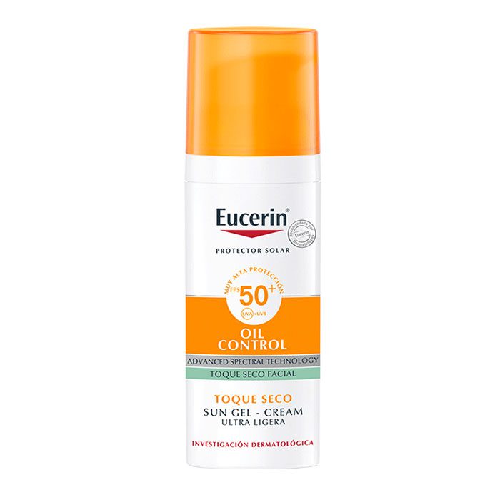Eucerin Sun Gel-Crema Oil Control Toque Seco FPS 50+ no provoca la aparición de espinillas, no contiene perfumes ni parabenos, y es ideal como base de maquillaje.